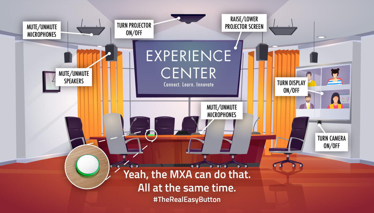 Even smaller than the touchscreen is Shure’s MXA Mute Network button. This little button was designed to be a quick and easy way to mute your microphones during a video conference. Tapping the button will mute or unmute your Shure networked audio products, making it extremely effective for those moments in meetings when you need to quickly turn your mics off in order to hold a brief private conversation. But the MXA Mute Network button is also compatible with third party control systems via programmable control strings, meaning you can do so much more than just mute your mics.