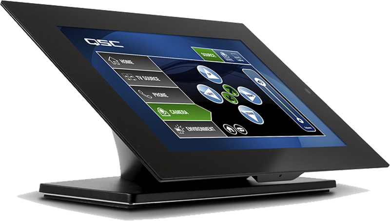Controlling all of these elements is made incredibly easy thanks to the Q-SYS ecosystem. Their TSC80 touchscreen controller allows intuitive control of everything, from the camera to the microphone. You can even control the projector with it. Raise and lower your screen, mute the microphones, pan and zoom the camera, turn the speakers’ volume up and down, it can all be done with the touch of a finger. And the touchscreen controller can be completely customized and branded for your needs.